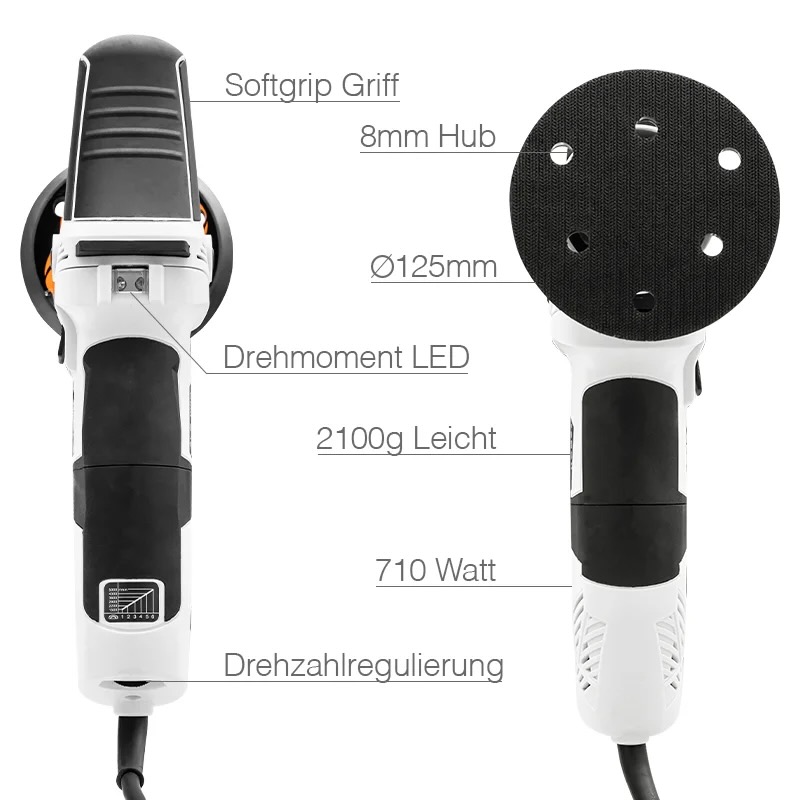 Nová a vylepšená excentrická leštička Liquid Elements T2000 V4 s výkmitem 8mm se standardně dodávaným unašečem o průměru 125 mm a výkonem 710 W.